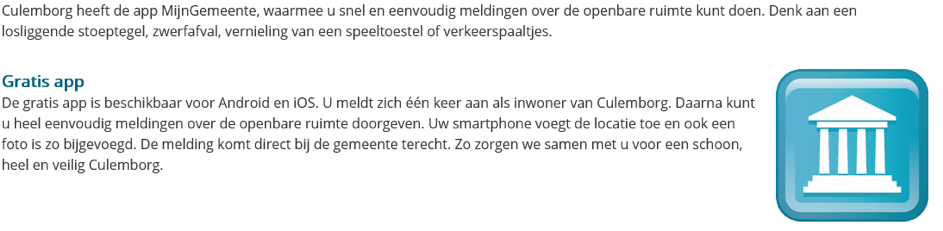 Een storing in de straatverlichting, bijvoorbeeld een kapotte lamp, kunt u telefonisch melden: 0345-477959, per e-mail: info@culemborg.nl, of met de gratis app MijnGemeente. Ook is het mogelijk de klacht online te melden bij: https://www.burgerklacht.nl/culemborg/melding.php